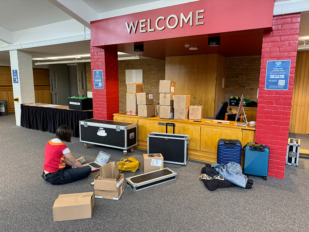 Admin times at the reception desk at West Road Concert Hall. Note the unpacked suitcase and boxes and boxes (and boxes) of flyers...